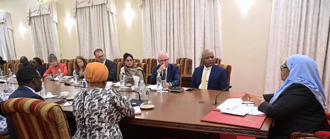 Rais wa Jamhuri ya Muungano wa Tanzania Mhe. Samia Suluhu Hassan akizungumza na Mratibu wa Kimataifa wa Mpango wa Dharura wa Rais wa Marekani katika mwitikio wa kupambana na Ukimwi (PEPFAR) na Mwakilishi Maalum wa Serikali ya Marekani katika masuala ya Diplomasia ya Afya Balozi Dkt. John Nkengasong, pamoja na Mtendaji Mkuu wa Shirika la Kimataifa la kupambana na Ukimwi, Kifua Kikuu na Malaria (Global Fund) Bw. Peter Sands, Ikulu Chamwino Mkoani Dodoma